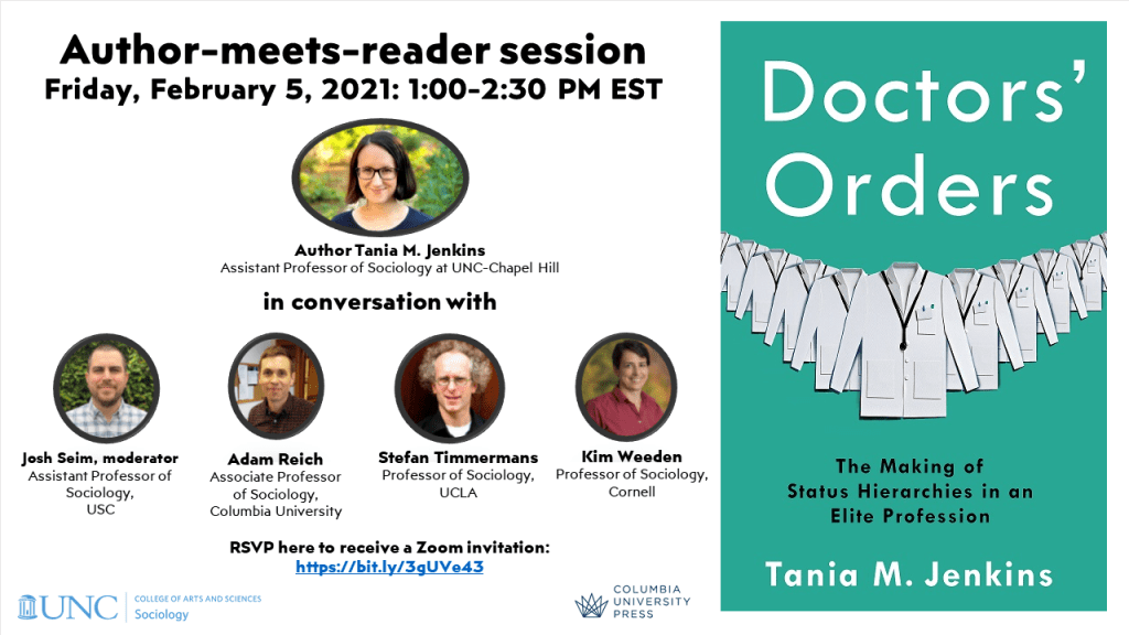 Please join us for an author-meets-reader session for UNC Sociology assistant professor, Tania Jenkins’, new book Doctors’ Orders, on Friday, February 5 from 1:00-2:30P EST.